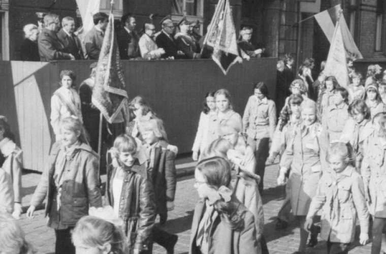 Harcerze maszerujący przed trybuną honorową ustawioną przy budynku KMG PZPR w Koźminie Wlkp.