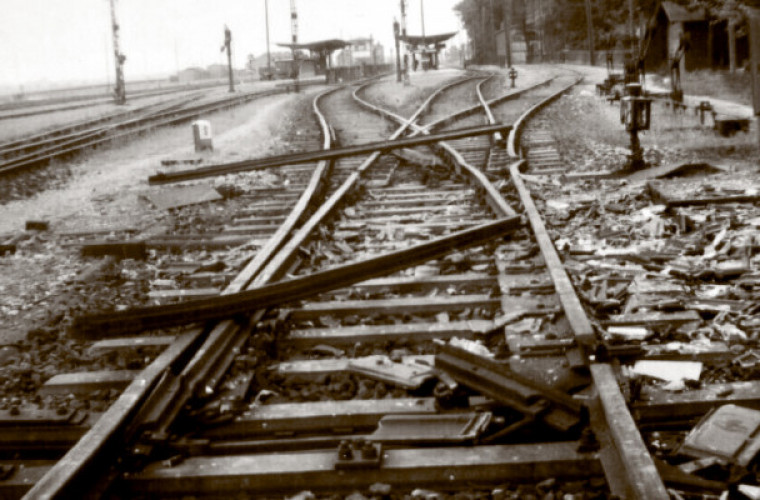 Uszkodzone tory kolejowe na stacji PKP w Krotoszynie. Zniszczeń dokonało wycofujące się wojsko polskie 1 września 1939 roku.