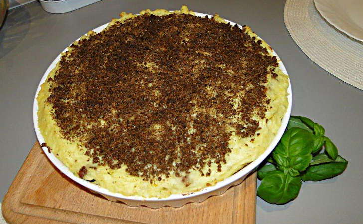 Usmażone mięso z grzybami przełóż do żaroodpornego okrągłego naczynia. Przygotowane puree ułóż równomiernie na przygotowanym gulaszu. Żółtko roztrzep z odrobiną mleka (od gotowania ziemniaków) i rozsmaruj po ziemniakach. Całość posyp zmielonymi grzybami wymieszanymi z bułką tartą. Wkłóż do piekarnika i zapiekaj około 30 minut w 180 stopniach Celsjusza.