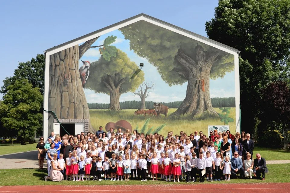 Piękny mural zdobi fasadę budynku sali gimnastycznej. Ma on na celu przekazywać informacje edukacyjne o tematyce przyrodniczej, takie jak bioróżnorodność, zrównoważony rozwój czy ekosystemy. To dzieło jest dowodem na zaangażowanie społeczności szkolnej j w ochronę środowiska naturalnego oraz promocję ekologii w swoim otoczeniu. Jest to doskonały przykład na wspieranie wartości edukacyjnych oraz estetycznych poprzez sztukę miejską - informują władze gminy Krotoszyn.
