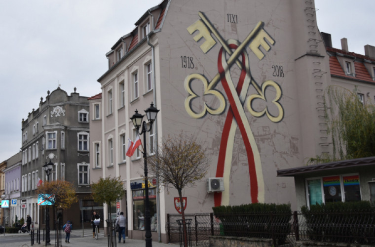 Mural niepodległościowy w centrum Krotoszyna przedstawia klucze przepasane flagą na tle planu miasta.