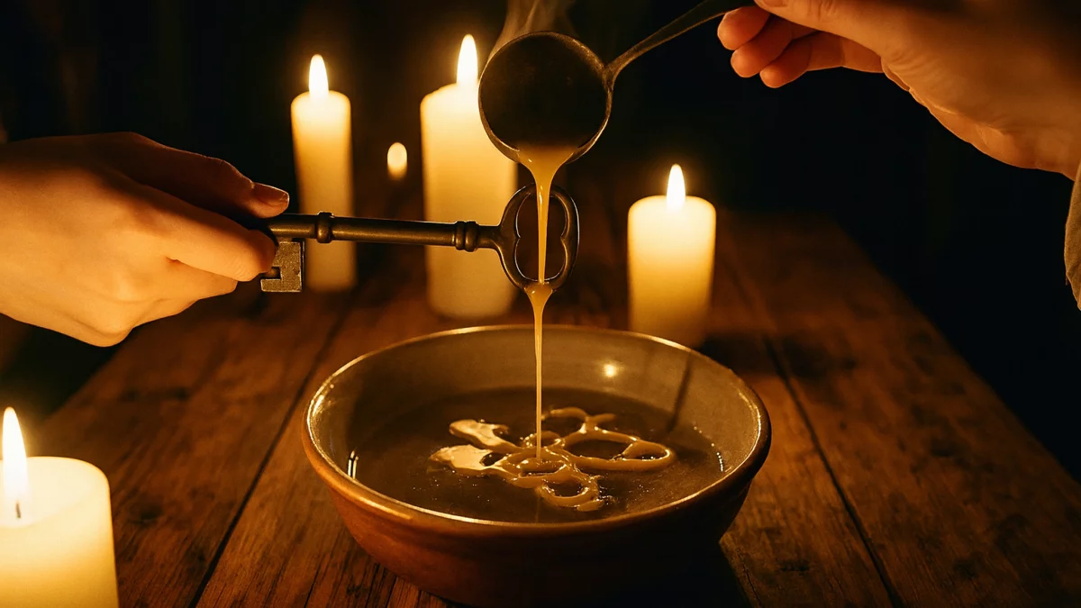 Roztop świecę nad ogniem lub w metalowej łyżce. Nad miską z zimną wodą trzymaj klucz — najlepiej taki z tradycyjną, dekoracyjną dziurką. Wlewaj powoli rozgrzany wosk przez otwór, pozwalając mu swobodnie spływać i zastygać. Po odczekaniu chwili wyjmij powstały kształt.
