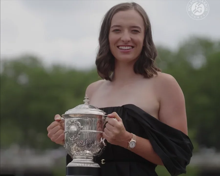 Iga Świątek zamieniła w niedzielę sportowy strój na elegancką, czarną sukienkę z opadającymi ramiączkami, a adidasy na klapki na kilkucentymetrowym obcasie. Na głowie tym razem zamiast czapki z daszkiem można było dostrzec ułożoną w fale fryzurę, a na twarzy delikatny makijaż. W taki wydaniu zobaczyli tenisistkę dziennikarze, którzy przybyli sfotografować ją po jej kolejnym zwycięstwie. Zdjęcie robiono na moście Bir-Hakeim, w tle widzimy wieżę Eiffla. W rękach Igi znalazło się jej kolejne cenne trofeum.