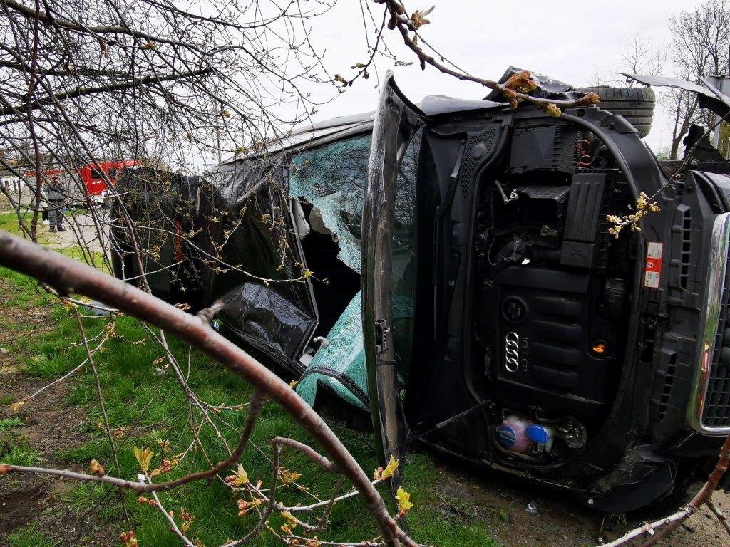 Siła uderzenia była tak duża, że Audi zostało zepchnięte na pobocze i przewróciło się na bok. Na miejsce wypadku w Bożacinie zadysponowano służby ratunkowe.