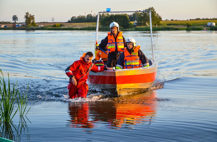 Wreszcie straż pożarna wkracza do działań. Ratownicy przejmują dwóch mężczyzn, którzy jako pierwsi wpadli do wody. Wydobywają ich na brzeg i okrywają kocami termicznymi.