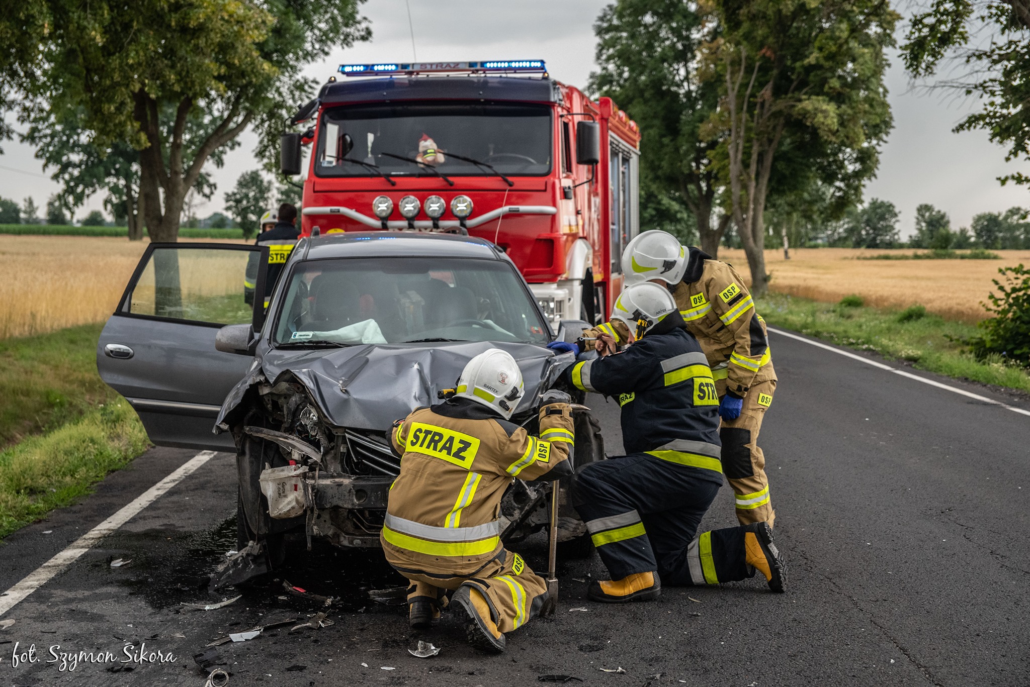 Na miejsce wypadku skierowano strażaków z Ochotniczej Straży Pożarnej w Koźminie Wlkp., policję i Zespół Ratownictwa Medycznego. Strażacy zabezpieczyli miejsce wypadku, udzielili uczestnikom wypadku pomocy medycznej, odłączyli akumulatory w rozbitych pojazdach oraz uprzątnęli z jezdni pozostałości pokolizyjne.