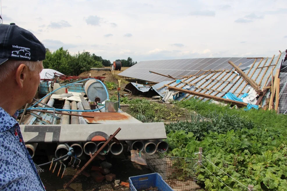 Ciężkie drewniane bele z dachu porwało w różne strony, na kilkadziesiąt metrów. Część uszkodziła znajdującą się przy podwórku instalację fotowoltaiczną, inna spadła za stodołę. Kilka belek wylądowało przed jej drzwiami.