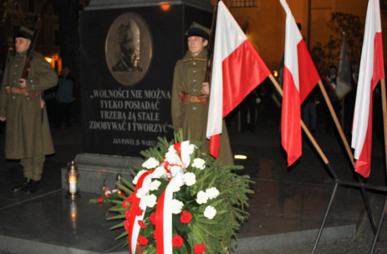 godz. 17:15 - Ceremonia podniesienia flagi państwowej na Ratuszu; przemarsz uczestników na Plac Jana Pawła II; złożenie wiązanek kwiatów pod Pomnikiem Wolności