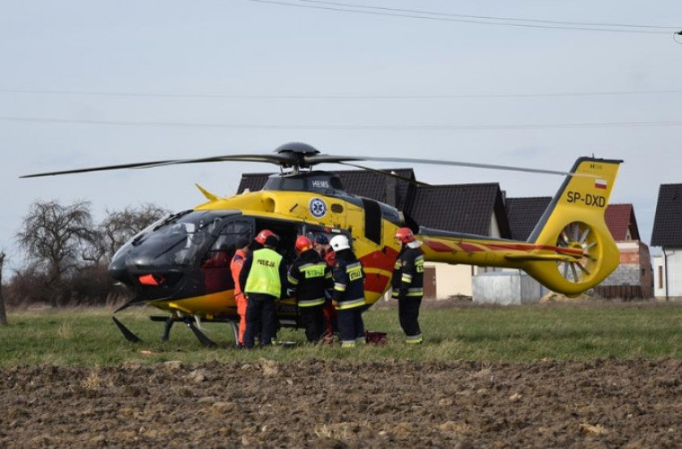 Mężczyzna m.in. z otwartym złamaniem nogi i urazem głowy został drogą lotniczą przetransportowany do specjalistycznej placówki medycznej.