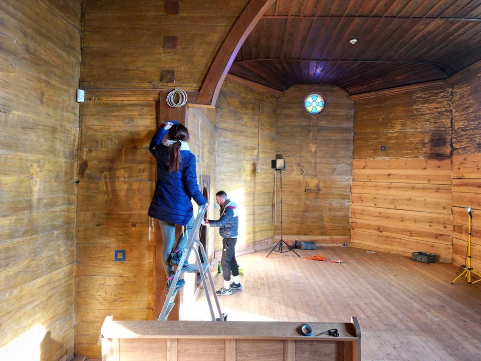 - prace konserwatorskie wewnątrz budynku w zakresie ścian, sufitów i empory organowej, mające na celu uzupełnienie ubytków pomiędzy elementami drewnianymi,
