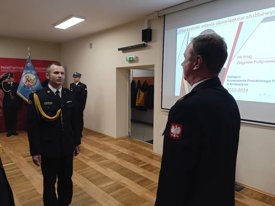 Oficjalne zdanie obowiązków służbowych odbyło się 24 stycznia 2024 roku w siedzibie Komendy Wojewódzkiej Państwowej Straży Pożarnej w Poznaniu, gdzie pełniący obowiązki wielkopolskiego komendanta wojewódzkiego PSP st. bryg. Tomasz Grelak wręczył Decyzję komendanta głównego o zwolnieniu ze służby w Państwowej Straży Pożarnej z dniem 25 stycznia 2024 roku oraz przyjął meldunek o zdaniu obowiązków służbowych. W uroczystości udział brał zastępca wielkopolskiego komendanta wojewódzkiego PSP bryg. Robert Natunewicz oraz komendant powiatowy PSP w Krotoszynie st. bryg. Marek Kalak - informuje st. kpt. Tomasz Patryas, oficer prasowy komendanta powiatowego Państwowej Straży Pożarnej w Krotoszynie.
