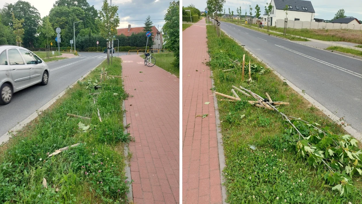 Zniszczono także 6 palików podpierających zniszczone drzewa oraz dwa paliki przy drzewie sąsiednim.