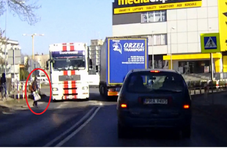 Na ulicy Mickiewicza w Krotoszynie jest spory ruch. Ciąg samochodów jedzie przez krajówkę. W pewnym momencie kobieta schodzi z chodnika na przejście dla pieszych, wprost pod jadącą ciężarówkę. Cudem unika potrącenia, w ostatniej chwili cofając się na chodnik.