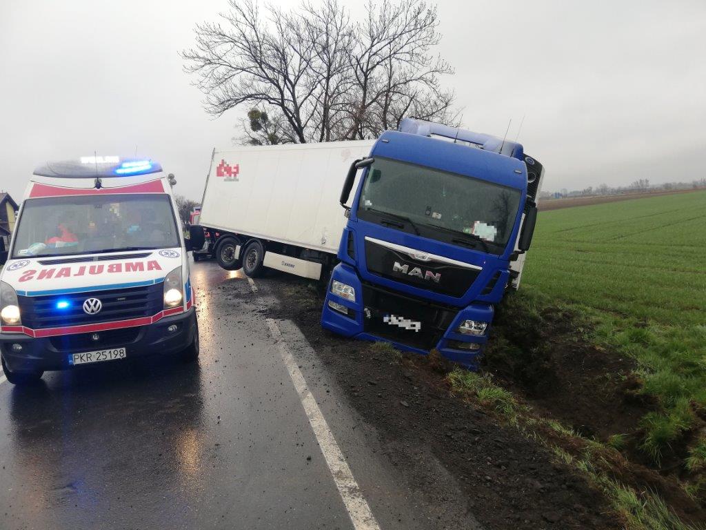 Po dotarciu na miejsce zdarzenia, Kierujący Działaniem Ratowniczym w wyniku przeprowadzonego rozpoznania ustalił, że samochód ciężarowy znajduje się w rowie, tył naczepy blokuje jeden pas drogi. Kierowca samodzielnie opuścił pojazd – informuje Tomasz Patryas, oficer prasowy KP PSP w Krotoszynie.