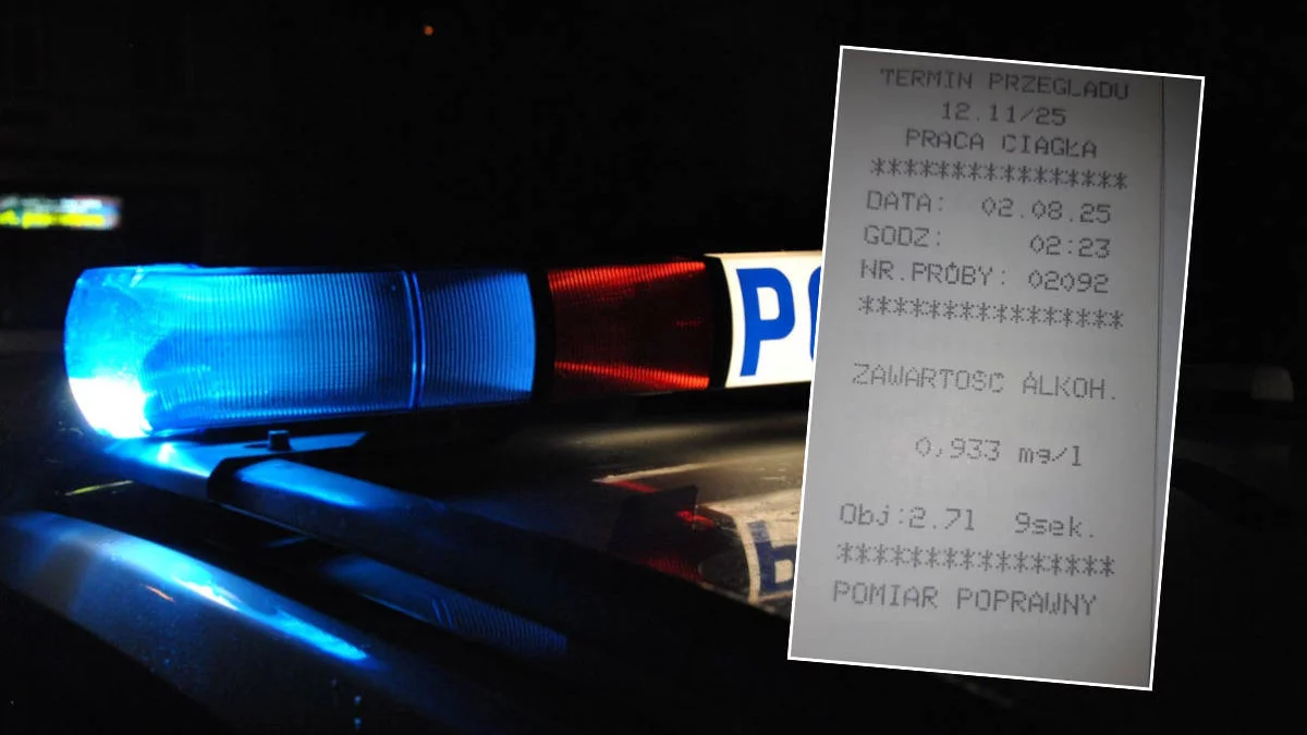 Mundurowi sprawdzili stan trzeźwości kierowcy forda mondeo. Pierwszy pomiar - jak informuje KPP w Krotoszynie - wskazał 0,933 mg/dm³ (ponad 1,9 promila), kolejny - 1,001 mg/dm³ (2,1 promila).