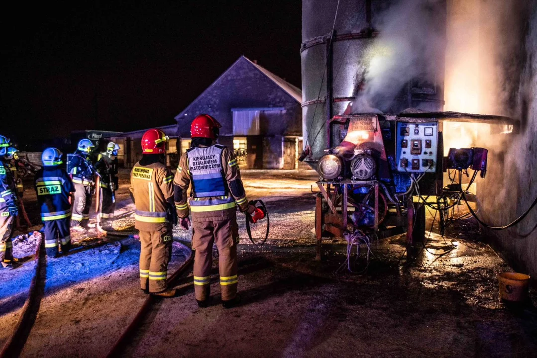 Strażacy po dojeżdzie do Gałązek w gm. Koźmin Wlkp. ustalili, że pali się przewoźna suszarnia wypełniona ziarnem kukurydzy.