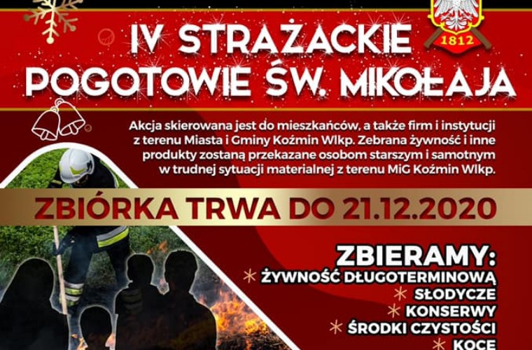 Strażacy z OSP Koźmin Wlkp., - po raz czwarty już – organizują zbiórkę żywności długoterminowej, słodyczy, środków czystości, konserw i koców dla osób starszych i potrzebujących z terenu gminy Koźmin Wlkp.