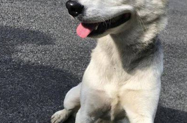 Porzucona suczka jest w typie Husky, ma około 1-3 lata, biała z niebieskimi oczami.
