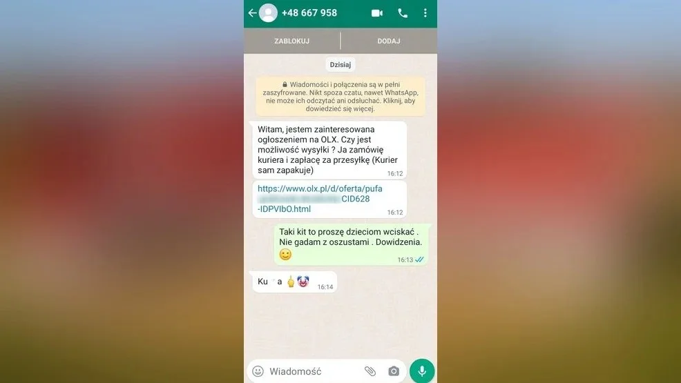 Nasza internautka poinformowała "zainteresowaną" towarem, że taki kit może dzieciom sprzedawać, a nie jej i, że nie rozmawia z oszustami. Kulturalnie pożegnała się.