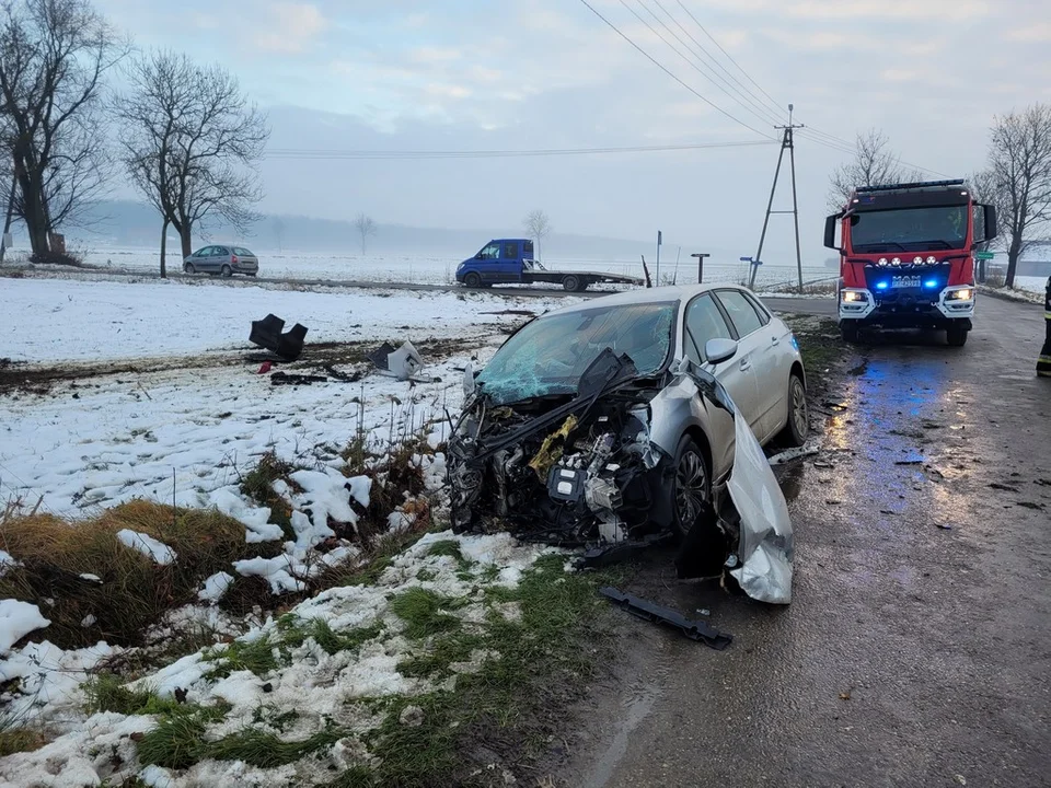 Na skrzyżowaniu dróg powiatowych zderzyły się dwa samochody: Seat Alhambra i Citroen C4. Siła uderzenia była na tyle duża, że Seat wypadł z drogi i zatrzymał się w polu, natomiast Citroen pozostał na jezdni z mocno uszkodzonym przodem.