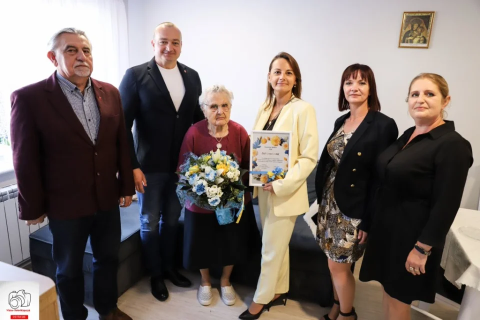 Burmistrz Kobylina Tomasz Lesiński, przewodniczący rady miejskiej Piotr Chlebowski, kierownik Urzędu Stanu Cywilnego w Kobylinie Żaneta Golińska i sołtys Zdziętaw Hanna Szymańska odwiedzili panią Zofię Grześkowiak, która świętowała 101. urodziny.